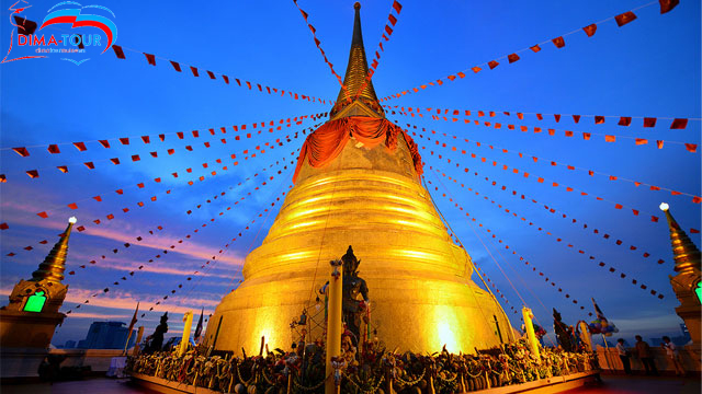Trên đường ghé tham quan Chùa Núi Vàng - WAT SAKET – được xây dựng trong thời kỳ Ayuthaya lúc đầu ngôi chùa có tên là Wat Saket. Đến năm 1782 Đại tướng có tên là Chakri đã mang viên Lục Ngọc Bảo Đức Phật từ nước Lào chở về trên đường đến về Thonburi, ông đã dừng chân tại ngôi đền này và đã tắm đúng theo nghi lễ trang trọng sau đó chở về Thonburi, ông được tôn làm Hoàng đế Rama I.